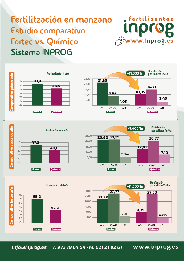 nous avons démontré la supériorité de notre gamme d’engrais organo-minéraux FORTEC-FR® par rapport aux engrais chimiques et autres engrais organo-minéraux , comme l’a certifié l’IRTA (Instituto de Investigación y Tecnología Agroalimentaria): dans une culture telle que celle du pommier. Voir Essai dans la culture du pommier.